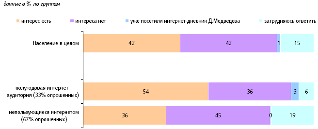 Около 42% опрошенных заявляют, что им было бы интересно посетить блог президента, около 1% опрошенных говорят, что уже были там. Среди интернет-пользователей эти показатели составляют 54% и 3% соответственно. Таким образом, можно предположить, что именно эти 57% полугодовой аудитории (около 19% населения страны) являются реально возможной аудиторией президентского блога.