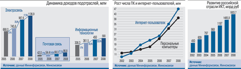 кризисное второе полугодие 2008 г. не сильно сказалось на итогах года для связи и ИТ. Общий объем сектора ИКТ за 2008 г. в 1803,7 млрд руб. означает 21,4%-ный рост по сравнению с 2007 г. (что ниже 25,8%-ного роста в 2007 г., но все равно является более чем оптимистичным показателем). 63% в размер отрасли в денежном выражении внесла электросвязь, 32% – ИТ и лишь 5% – почта. По темпам роста лидируют ИТ (плюс 28,9%, практически как и в 2007 г.), телеком снизил скорость роста с 25,4% в 2007 г. до 17,5% в 2008 г.