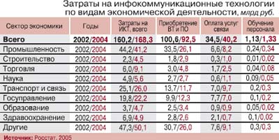 Возрастающую роль ИКТ в национальной экономике (подробнее см. «ИКС» № 12'2003, с. 32–56) интересно проиллюстрировать ростом использования продукта связи на основе данных опроса предприятий различных отраслей национального хозяйства об увеличении их затрат на инфокоммуникации за 2002-2004 гг. Их сумма оценивается в 170 млрд руб. Среди лидеров – органы госуправления, научно-исследовательский сектор, транспорт и связь.