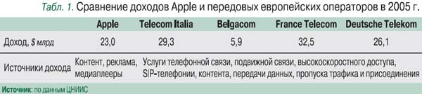 Примером успешного внедрения подобной бизнес-модели может служить опыт компании Apple. Для стимулирования продаж медиаплееров iPod производитель оборудования организовал портал iTunes, где пользователь может приобрести видео- и аудиоконтент, заказать покупку и доставку плеера iPod. В результате в 2005 г. продажи плееров возросли на 14 млн шт., ежемесячная посещаемость портала достигла свыше 20 млн пользователей, а доход компании в этом секторе рынка составил более $20 млрд, что сопоставимо с годовым доходом многих европейских операторов фиксированной связи (табл. 1).