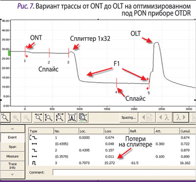 Применение OTDR для контроля сетей FTTx требует тщательной настройки измерений и оптимизации прибора под задачи указанных сетей. Причиной тому – широкое применение в сетях FTTx (в первую очередь в сетях PON) кабельных систем древовидной топологии. Если OTDR не оптимизирован под задачи тестирования PON, сигналы от разных «плеч» древовидной системы могут мешать друг другу, в результате чего полученные трассировки рефлектограмм окажутся бесполезными. На измерениях отрицательно сказывается и присутствие сплиттеров в тестируемом канале. Потери тестового оптического сигнала в процессе его отражения на сплиттере приводят к появлению характерной «ямы» на рефлектограмме, так что рефлектометр должен иметь достаточный динамический диапазон для отображения состояния кабеля после сплиттера.