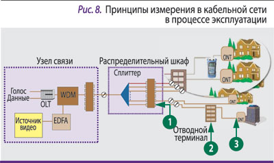 Обычно показателем качества подключения служит уровень затухания сигнала. Несмотря на внешнюю простоту схемы организации измерений (рис. 8), измерения на этом этапе имеют свои нюансы: во-первых, теперь они привязаны не к волокнам, а к пользователю или конкретному ONT; во-вторых, важно измерить затухание не в одной, а в нескольких точках.