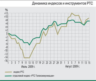 Дополнительную поддержку российскому рынку акций традиционно оказывал рост цен на мировом рынке нефти. Так, в период с 1 июля по 15 августа котировки цен на нефть марки Brent повысились на 3,91%, до $71,47 за баррель. При этом полтора месяца на сырьевом рынке наблюдалась повышенная волатильность, в частности в начале августа цена на нефть достигала исторических максимумов, превышая уровень $75 за баррель.С 1 июля к 15 августа индекс ММВБ вырос на 5,95%, до уровня 1072,74 пункта. Индекс РТС за тот же период прибавил, в том числе на фоне высокой волатильности валютного рынка, еще больше – 8,38%, достигнув 1059,92 пункта. Котировки большинства бумаг компаний телекоммуникационного сектора росли в основном лучше российского фондового рынка в целом. Так, отраслевой телекоммуникационный индекс ММВБ – MICEX TLC – за полтора месяца повысился на 9,67% (до уровня 1180,03 пункта), а индекс «РТС Телекоммуникации» вырос на 6,71%, и составил 122,52 пункта.