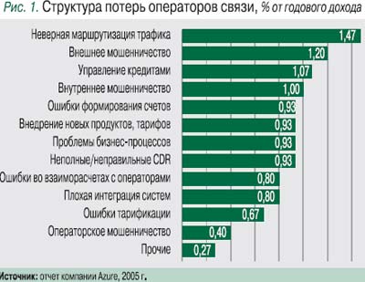 Полностью предотвратить потери – задача неосуществимая, поскольку устранение даже небольшой их доли часто требует несопоставимых затрат. Поэтому операторы заведомо согласны нести «свой процент» потерь, причем большинство из них устанавливают допустимую для себя планку в 1% от годового дохода. Надо сказать, что оценки величины потерь самих телекоммуникационных компаний и независимых маркетинговых агентств сильно разнятся. По данным операторов, их ежегодные потери составляют около 3,5% годового оборота, тогда как, по оценкам Analytics Research, основанным на результатах опроса 104 компаний во всем мире, эта цифра значительно выше – примерно 11,6% годовой выручки. Распределение потерь оператора связи (согласно отчету Azure «Operator Attitudes to Revenue Assurance 2005») представлено на рис. 1.
