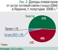 По мере роста абонентской базы растут и доходы операторов. Согласно подсчетам «iKS-Консалтинг», в I квартале объем доходов операторов сотовой связи Украины (по US GAAP) достиг $688 млн – на 56% больше, чем за аналогичный период 2005 г. Лидером по объему выручки второй квартал подряд становился «Киевстар» (рис. 2) – около 51% ($348,7 млн) общей выручки операторов, доля UMC – 46% ($317 млн). «Киевстар» – бесспорный лидер и по объему чистой прибыли, которая по итогам I квартала 2006 г. достигла $111 млн, или 32% выручки. Чистая прибыль UMC за I квартал куда скромнее – $62 млн, или 20% выручки.