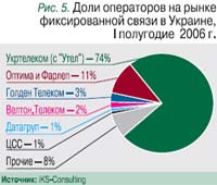 Для рынка фиксированной связи показательна значительная консолидация – на четверку ведущих операторов приходится около 90% рынка (рис. 5), из которых 74% генерирует все еще принадлежащий государству «Укртелеком». О том, что консолидация рынка, обусловленная фактором экономии на масштабах, продолжится, свидетельствуют слияния и поглощения, имевшие место в I полугодии 2006 г.