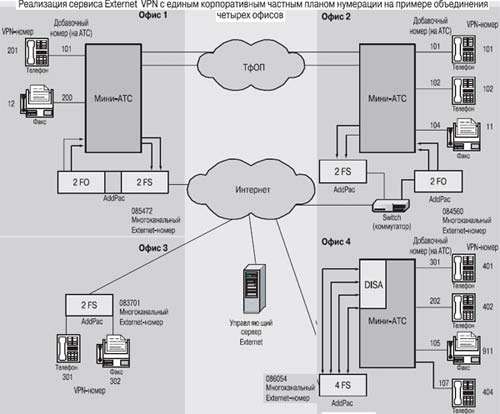 Работу сервиса Externet VPN с единым корпоративным частным планом нумерации рассмотрим на примере объединения четырех офисов (рисунок).