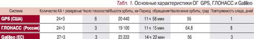 GPS на подъеме. Система разработана по заказу Минобороны США на базе 24 навигационных КА Block, выведенных в 1978 г. на круговую орбиту 20 440 км с наклонением 55° (табл. 1). В 90-е годы был открыт доступ к сервисам GPS и гражданским пользователям. Поначалу главный параметр – точность определения местоположения – для гражданских и военных целей был различен. Если в первом случае он составлял около 100 м (c вероятностью 95%), то для «своих» можно было достичь и полуметра. Однако в 2000 г. правительство США приняло решение отключить режим селективного доступа – теперь стандартной точностью считаются 15 м. В результате улучшения этой характеристики резко вырос рынок GPS-устройств, который, по прогнозу консалтинговой фирмы ABI, в 2008 г. превысит $22 млрд, в основном за счет увеличения доли средств индивидуальной навигации.ГЛОНАСС – зигзаг, еще зигзаг. Полный космический сегмент системы, центр управления и наземные станции которой подведомственны военно-космическим силам России, должен состоять из 24 КА в трех орбитальных плоскостях. Запуск ее первого спутника «Космос-1413» состоялся осенью 1982 г., система с неполной орбитальной группировкой (ОГ) была сдана в эксплуатацию в сентябре 1993 г. (Главное – опередить GPS!) И лишь в самом конце 1995 г. количество КА было доведено до необходимых 24. Однако уже к лету 2001 г. на орбите осталось лишь 6 активных КА. Ситуацию удалось частично выправить: в декабре 2004 г. были выведены на орбиту три КА, в том числе спутник нового поколения ГЛОНАСС-М. Сегодня на орбите лишь 17 аппаратов, что не позволяет полноценно обслуживать северные широты РФ и создает значительные задержки при определении координат. Планируется к 2007 г. увеличить число КА до 18 (чтобы предоставлять навигационные услуги на 99% территории России), а полная комплектация ОГ ожидается не позднее 2010 г. На реализацию программы ГЛОНАСС планируется выделить 70,213 млрд руб.
