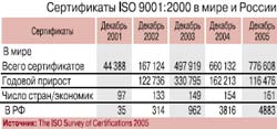 Россия занимает 12-е место в мире по объему ВВП. Как следует из таблицы, к началу 2006 г. в стране насчитывалось 4800 сертифицированных организаций, самый большой прирост сертификатов (2854) наблюдался в 2004 г. Это соответствует 13-му месту среди стран Европы и 25-му в мире. У нас пока эту процедуру проходят преимущественно крупные компании.