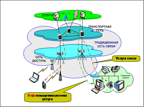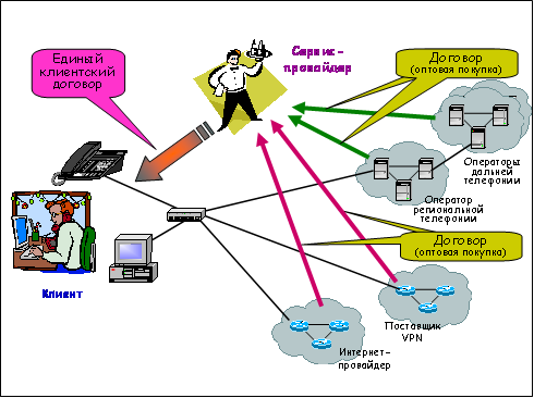- чаще всего (но совершенно необязательно, что всегда) этим сервис-провайдером будет оператор местной телекоммуникационной сети, контролирующий подключение абонентского терминала. Те услуги, которые выходят за рамки сети данного оператора/провайдера, покупаются им оптом у соответствующих операторов, имеющих необходимую сетевую инфраструктуру. Если договор с клиентом заключает «чистый» сервис-провайдер, не имеющий своих сетей связи, он покупает у операторов весь комплекс голосовых и иных услуг связи, предлагаемых пользователям в рамках пакетов инфокоммуникационных сервисов, включая и сам доступ к сети;
