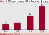 ИТ – вперед и выше Если ИT-рынок находится на ранней стадии развития, то сотовая связь вступает в фазу зрелости, а в секторе проводной связи темпы роста остаются умеренными. Поэтому в ближайшие годы российские ИT-компании будут расти на 20–25% (рис. 4), тогда как телекомы – лишь на 15–17% при росте всей российской экономики на 5–6%. Для сравнения: прогнозируемый ежегодный рост западного ИTрынка до 2010 гг. – 8–9%.