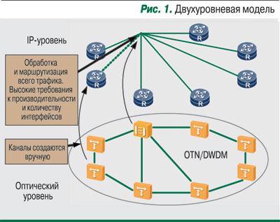 Традиционная двухуровневая модель работы IP/MPLS over WDM предполагает, что маршрутизаторы связаны логическими соединениями, а WDM