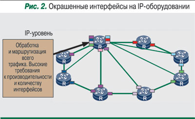 Другой реализацией сети IP/MPLS over WDM является установка окрашенных линейных интерфейсов WDM непосредственно в маршрутизаторы (рис. 2). Такой подход позволяет сократить количество оптико-электрических преобразований и естественным образом решает проблему взаимодействия оптического и IP-уровней сети.