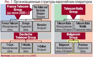 На европейском рынке существует два основных типа телекоммуникационных холдингов. Наиболее распространенный тип – холдинг, в который входят операторские компании, автономно работающие в разных сегментах рынка (фиксированной, мобильной связи и услуг Интернета) (рис. 1).