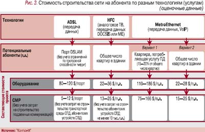 И. Колпаков («Контур-М»), анализируя стоимость строительства мультисервисной сети на абонента, дает два варианта ответа там, где речь идет о MetroEthernet, поскольку оператор сети передачи данных и оператор КТВ по-разному понимают потенциального абонента: первый говорит о потенциальных потребителях услуги, второй – о квартире (табл. 6, рис. 3), операторам «Связьинвеста» удобнее оперировать не потенциальными абонентами, а стоимостью на порт.