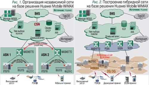 На базе решения Huawei Mobile WiMAX можно построить независимую сеть (рис. 1) или интегрировать сеть Mobile WiMAX с сетью сотовой связи 2G/3G (рис. 2). В развернутых сетях операторы смогут предоставлять пользователям широкий спектр услуг: голосовые и видеоуслуги, игры, отправку сообщений, Push-toX (Push-to-Talk и др.), конференц-связь.