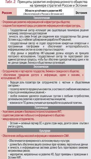 В принципе все программы построения ИО придерживаются примерно одних принципов (табл. 2). Вместе с тем в России устойчивость развития ИО только декларируется и нигде не говорится, какими путями это будет достигаться (см. www.scrf.gov.ru/conference/2006-06).