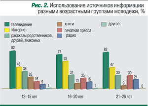 Как показали результаты опроса, главным источником информации для всех возрастных групп молодежи является телевидение. Тинейджеры (12–15 лет) значительно чаще смотрят телевизор по будням, чем представители старших возрастных групп. Особой популярностью у них, а также в возрастной категории 16–20 лет пользуются каналы развлекательного характера.