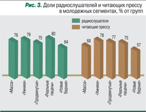 Выбор радиостанции существенно характеризует группы, ведь радио чаще слушают активные горожане, пользующиеся автомобилем, и студенты, т.е. представители групп «реальные пацаны» (80%) и «умники» (79%). Меньше всего радиослушателей среди «новых бедных» – 64% (рис. 3).