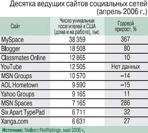 Потенциал сообществ очень велик. Опубликованная Nielsen/NetRatings десятка ведущих сайтов социальных сетей (данные за апрель 2006 г.) в сумме продемонстрировала рост на 47% по сравнению с предыдущим годом: их аудитория увеличилась с 46,8 млн уникальных посетителей в 2005 г. до 68 млн в апреле 2006 г. и охватила 45% всех активных пользователей Интернета в США.