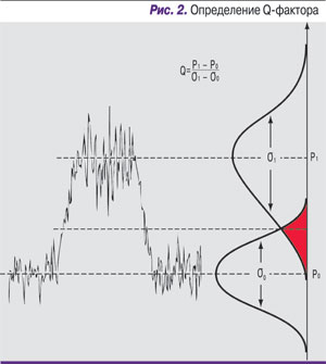 Коэффициент вероятности ошибки (BER) определяется величиной отношения сигнал/шум в системе и зависит от так называемого Q-фактора (рис. 2), т.е. напрямую от величины OMA. Таким образом, максимизировав отношение между двумя энергетическими уровнями сигнала, можно существенно уменьшить вероятность возникновения ошибки (площадь заштрихованной области).