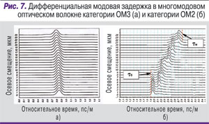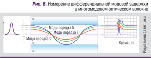 В идеальном случае модовое распределение является равновесным, т.е. каждая группа мод переносит определенную часть общей мощности волнового пакета. На выходе системы из-за разницы времени прихода различных групп мод возникает временная дифференциальная модовая задержка, приводящая к временн'ому уширению импульса (рис. 6).