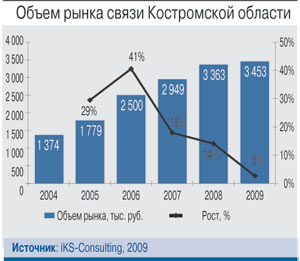 До XVII века Кострома была третьим по численности населения русским городом (уступающим только Москве и Ярославлю), центром текстильной промышленности. Именно здесь, в Ипатьевском монастыре, в 1613 г. был избран на царство первый из династии Романовых – 16-летний Михаил Федорович. Сегодня в Костромской области проживает 690 тыс. человек. Кострома по численности населения (270 тыс. человек) занимает лишь 68-е место в РФ; кроме нее, в области еще шесть небольших городков, самые крупные из которых – Буй, Нерехта и Шарья – насчитывают по 25 тыс. жителей. В структуре промышленного производства треть занимает электроэнергетика (Костромская ГРЭС – одна из крупнейших в Европе), следующие по значимости отрасли – лесная промышленность и машиностроение. Кострома традиционно славится льняными и ювелирными изделиями. В целом же на Костромскую область, где проживает 0,49% населения РФ, приходится всего лишь 0,24% ВВП. Соответственно, невелик и рынок связи: его объем в 2009 г. составил около 3,5 млрд руб., или 0,27% от всего российского телеком-рынка.