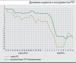 Капитализация «Уралсвязьинформа» снизилась на 11,77%, составив 0,974 руб. По данным отчетности, чистая прибыль компании по РСБУ в I квартале выросла в 2,1 раза – до 2,054,7 млрд руб., отношение чистой прибыли к выручке увеличилось на 9,6 процентных пункта – до 19,4%. При росте выручки на 5,9% (до 10,615 млрд руб.) «Уралсвязьинформ» благодаря жесткому контролю смог снизить затраты на 2,5% по сравнению с I кварталом 2009 г., что привело к существенному увеличению показателей экономической эффективности. Рост выручки обеспечило увеличение доходов от услуг передачи данных и доступа в Интернет, мобильной связи и местной телефонной связи. Еще одной благоприятной новостью стало сообщение Fitch Ratings, которое повысило долгосрочный рейтинг дефолта «Уралсвязьинформа» с ВВ- до ВВ, прогноз по рейтингу – «Стабильный».Котировки акций операторов сотовой связи выглядели несколько лучше сектора в целом. Так, бумаги МТС потеряли 7,9%, опустившись до отметки 248,56 руб. Оператор объявил об изменении с 3 мая 2010 г. соотношения между американскими депозитарными расписками, обращающимися на Нью-Йоркской фондовой бирже, и обыкновенными акциями компании. Теперь отношение АДР к обыкновенным акциям вместо 1:5 составляет 1:2. Стоит отметить и позитивные результаты МТС по РСБУ: чистая прибыль компании в I квартале 2010 г. увеличилась почти на 40% по сравнению с IV кварталом 2009 г., составив 10 598 046 тыс. руб. Росту финансовых показателей во многом способствовала волатильность курсов валют и уменьшение расходов на обслуживание кредитных линий, открытых для финансирования инвестиционной программы в 2009 г.