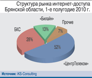 По оценкам iKS-Consulting, количество интернет-пользователей «ВымпелКома» в Брянске в конце 1-го полугодия 2010 г. достигло 13 тыс., что вывело его на третье место на рынке ШПД Брянской области. Первенство же в этой дисциплине ожидаемо удерживает «ЦентрТелеком» с более чем 50 тыс. интернет-абонентов. Но если за пределами Брянска конкурентов у «ЦентрТелекома» практически нет, то в самом городе традиционный монополист не выдерживает давления. Здесь его с первого места оттеснил оператор «Брянские кабельные сети» (БКС), который работает на рынке с 2002 г. и основной бизнес которого – предоставление услуг КТВ и интернет-доступа. К июлю 2010 г. количество подписчиков услуги доступа в Интернет у БКС достигло 28 тыс., а у «Центр-Телекома» – порядка 26 тыс.