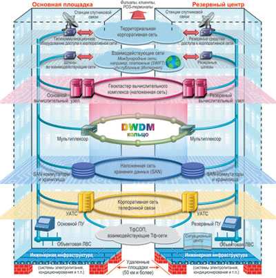 Учитывая, что сегодня банковские системы, как правило, ведут централизованную обработку платежной и другой информации, даже наличие автономных источников электроэнергии на основной площадке не гарантирует им связь с внешними объектами (филиалами, клиентами, другими платежными сетями). Нет гарантий работоспособности всей цепочки операторов связи в проблемном регионе. Кроме того, работа руководства и структурных подразделений организации на основной площадке в таких условиях будет затруднена дефицитом энергии из-за повышенного энергопотребления резервных источников. От способности безболезненно переносить подобные коллапсы и любые другие катаклизмы зависит, например, финансовая устойчивость и престиж банка. Поэтому все более широкое применение находят резервные центры, позволяющие нивелировать последствия не только технических аварий и ошибок обслуживающего персонала, но и крупных пожаров, обрушения зданий, заражения опасными программными вирусами, террористических актов (и ложных сообщений о них) и прочих чрезвычайных ситуаций. #999999">икс