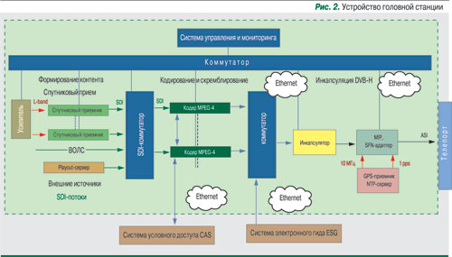 Оборудование формирования сигнала – центральная головная станция (ГС) цифрового телевизионного вещания стандарта DVB-H по способу формирования контента сходна с головными станциями кабельного ТВ и цифрового эфирного ТВ формата DVB-T. Основной контент принимается с помощью профессиональных спутниковых ресиверов. Для доставки контента можно организовать каналы на основе различных протоколов передачи и волоконно-оптических линий, напрямую связанных со студиями телеканалов или центрами формирования медиапотоков. Можно использовать и playout-серверы. Одно из основных условий состоит в том, что на вход головной станции должен подаваться видеосигнал в формате SD-SDI (рис. 2).