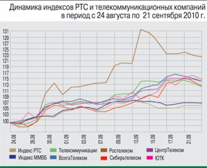 Бумаги «ЦентрТелекома» выросли на 8,72%, достигнув уровня 26,31 руб. за акцию. Поддержку акциям оказала публикация позитивной отчетности по МСФО за I полугодие 2010 г., согласно которой чистая прибыль компании по сравнению с аналогичным периодом 2009 г. (2927 млн руб.) выросла на 42% и составила 4155 млн руб. Выручка от реализации увеличилась по сравнению с аналогичным периодом прошлого года (18 212 млн руб.), составив 19 976 млн руб. Также стало известно, что совет директоров «ЦентрТелекома» принял решение отложить рассмотрение вопроса об участии общества в Akado International Limited. Такое решение было принято в связи с поступлением информации о том, что компания Renova Media Enterprises готова обсудить альтернативную структуру сделки.