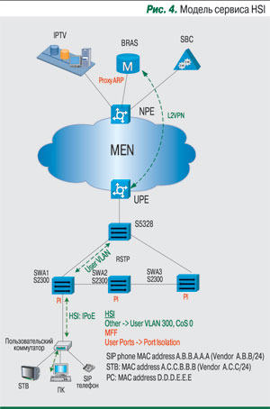 Каждый из этих сервисов имеет свои специфические требования к сети передачи данных. Так, HSI обеспечивает высокоскоростной доступ к ресурсам Интернета, коммерческим телематическим сервисам компании, межпользовательский обмен трафиком. На уровне доступа используются протоколы IPoE и PPPoE, сервис в большинстве случаях предоставляется агрегаторами трафика широкополосного доступа (BRAS). Для него обычно обеспечивается базовое качество сервиса.