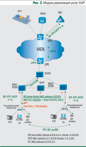 - Трафик RTP (голосовой). механизмы его доставки и приоритизации также аналогичны механизмам доставки SIP и служебного трафика. Хождение трафика между пользователями на коммутаторах агрегации и доступа блокируется функционалами Port Isolation и MFF (см. выше, модель IPTV). Для обмена RTP-трафиком между SIP-телефонами на терминирующем пограничном маршрутизаторе, в голосовом VLAN, активизируется функционал Proxy ARP.