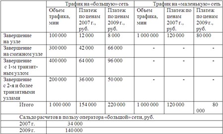 Сальдо расчетов ощутимо меняется в пользу оператора крупной сети. В таблице приведен гипотетический пример, показывающий динамику платежей при равном объеме трафика, протекающего в обоих направлениях через стык большой сети и маленькой, состоящей из одного коммутатора. Цены на услуги по пропуску трафика взяты из рис. 1.
