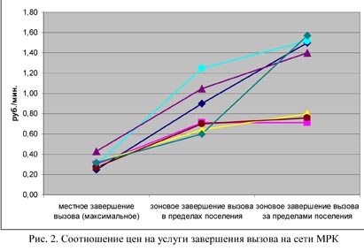 Сегодня услуги зонового завершения вызова в пределах областного центра дороже самого дорогого местного завершения вызова на сеть того же оператора в два – три раза и более. И это, как уже отмечалось, при вполне близкой реальной себестоимости. При этом зоновое завершение вызова за пределами центра субъектов РФ стоит как правило всего в 2 раза дороже (за исключением МГТС, у которой такой услуги нет, и одной из МРК) хотя затраты на завершение вызова в пределах города и на расстоянии, подчас, более 2 тыс. км явно различаются гораздо более существенно.