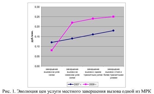Если согласиться с этой моделью, остается как минимум пара существенных вопросов, один из которых «сколько?», а второй – «почему?». Под «сколько» понимается количественная оценка соотношения себестоимости минуты завершения вызова на сеть оператора, имеющую ту или иную структуру и емкость, ведь взаимодействуют между собой сети самого разного размера. Наверное, проведя соответствующие исследования, можно получить необходимую зависимость, если, конечно, доверять исходным данным, получаемым от операторов. Как показывает опыт, с этим тоже есть проблемы, операторы ухитряются обосновать перед регулирующими органами такие соотношения тарифов, которые совершенно не укладываются в здравый смысл. Например, на рис. 1 показана эволюция цен на услуги местного завершения вызовов одного из «существенных» операторов. Правда, занятно? Почему так радикально изменилось соотношение цен пропуска трафика на одной и той же местной сети областного центра? Ведь структура ГТС емкостью несколько сотен тысяч номеров за два года практически не изменилась, да и зачем ее менять, если она разумная?...