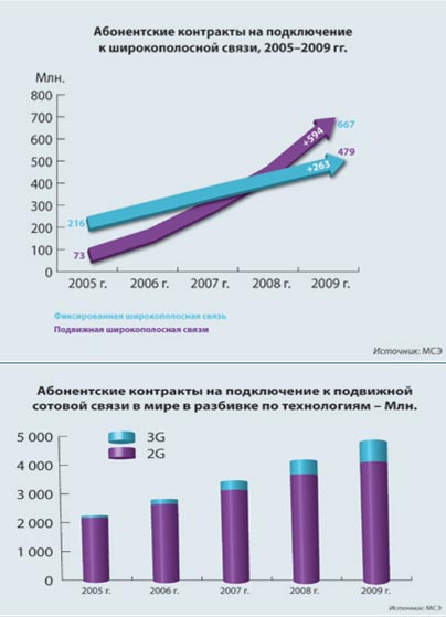 К началу 2010 г. во всем мире было зарегистрировано 479 млн абонентских контрактов на подключение к фиксированной широкополосной связи (уровень проникновения - 22,6%) против 216 млн в начале 2006 г. за то же время количество 3G-контрактов выросло с 73 млн до 667 млн, т.е. почти в 10 раз. Это больше, чем число контрактов на подключение к сетям сотовой связи в начале десятилетия (491 млн). Увеличивается и доля контрактов на подключение к 3G в общем объеме абонентских контрактов на подвижную сотовую связь - с 3% в 2006 г. до 14% в начале 2010 г.