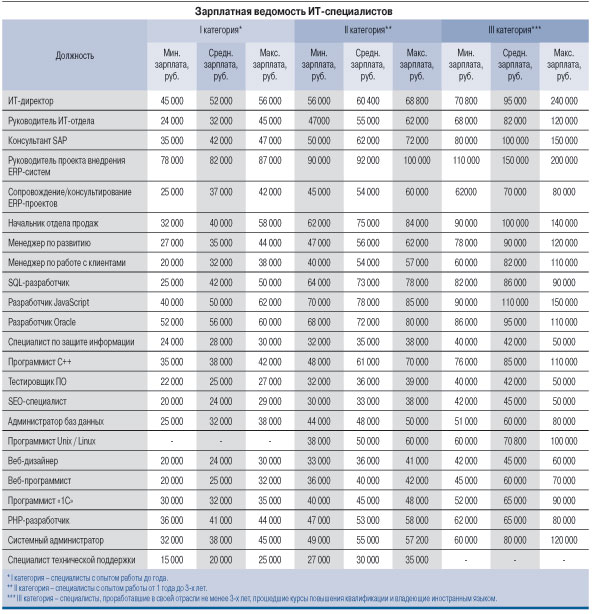 Проанализировав предложения работодателей (см. таблицу на с. 22), мы пришли к выводу, что наиболее высоки заработные платы в ИТ-компаниях, где доход сотрудника напрямую зависит от уникальности проекта. Для привлечения редких и наиболее востребованных на рынке кандидатов уровень оплаты часто завышается.