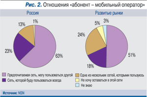Одна из опасностей телеком-рынка высокого уровня развития, о которой предупреждает С. Киндт, – большая подвижность клиентов в плане взаимоотношений с операторами, не слишком прочная «привязанность» к одной сети. Например, в России 23% абонентов уверены в своем операторе, на более развитых рынках данный показатель ниже – 18% (рис. 2). К этому идем. Основанием для недовольства оператором могут стать высокие цены на услуги (62%), неудовлетворительное качество голосовой связи (48%), недостаточное покрытие сети (41%). В тройке причин для смены оператора называются: невысокое качество связи (46%); друзья пользуются другим оператором (40%); у другого оператора есть интересное предложение (24%).
