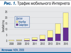 Смартфонов в руках у пользователей все больше, хотя на рынке мобильного доступа в Интернет превалируют ноутбуки (рис. 1), которые и генерируют сегодня основной поток данных, – ведь до последнего времени большинство мобильных широкополосных сетей развивалось с прицелом на ноутбуки, а не на смартфоны. Как считают специалисты, трафик с обоих типов устройств сравняется к 2015 г., и тогда наступит «время смартфона» не только применительно к имиджу его обладателя (что происходит сейчас), но и в отношении операторского бизнеса.