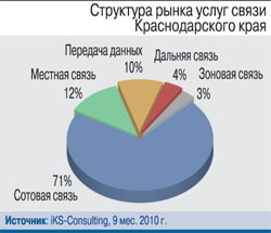 В сфере телекоммуникаций Кубань – тоже в числе лидеров: на нее приходится 40% телеком-выручки от регионов ЮФО. Львиная доля кубанского «телекоммуникационного пирога», более 70% совокупных доходов, принадлежит сотовым операторам.