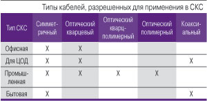 В настоящее время техника структурированного каблирования, известная своими хорошими потребительскими качествами, широко используется в самых разных, радикально отличающихся областях. Соответственно существует несколько разновидностей СКС, изначальная адаптация которых к конкретной сфере применения позволяет в полной мере учесть особенности этой сферы. Типы кабелей, разрешенные для применения в процессе построения СКС, приведены в таблице. При этом для любой области использования нормативные документы лишь фиксируют разрешенные типы кабелей. Столь необходимые проектировщику и инженеру однозначные рекомендации даже по предпочтительным областям их применения – за исключением, может быть, предельной протяженности трактов – в публикациях отсутствуют.