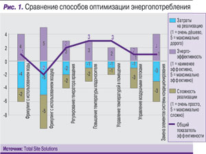 К менее затратным подходам к оптимизации систем кондиционирования следует отнести изменение климатических параметров в помещении серверной. Он, кстати, нашел отражение и в официальных рекомендациях для дата-центров, сформулированных ASHRAE в 2008 г.: так, если в документах 2004 г. температура в серверной устанавливалась в диапазоне 20–25°С при влажности 40–50%, то в рекомендациях 2008 г. это соответственно 18–27°С при влажности 40–60%. Благодаря изменившимся требованиям производителей ИКТ-оборудования владельцы дата-центров получили возможность существенно снизить уровень энергопотребления климатических систем, отвечающих за поддержание точных температурных параметров в помещении. И этим обязательно надо воспользоваться. Чтобы выполнить данную рекомендацию, можно, например, повысить температуру хладоносителя. Затраты на реализацию метода нулевые – ведь сама система остается той же. По упомянутой выше пятибалльной системе данный метод можно оценить следующим образом: затраты на инсталляцию = 1, сложность = 1, эффективность = 2. Так что никаких причин пренебречь этим методом нет.