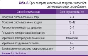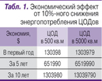 Экономический эффект в данном случае, безусловно, определяется масштабами площадки, ее исходным состоянием и другими факторами. Для наглядности мы взяли один из реальных российских дата-центров с энергопотреблением 1618 Вт/кв.м и коэффициентом PUE = 2,3 и рассчитали экономический эффект (табл. 1), который можно получить при 10%-ном снижении энергопотребления на площади 500 кв.м (ИКТ-нагрузка 809 кВт) и 5000 кв.м (ИКТ-нагрузка 8090 кВт).