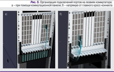 Сегодня некоторые производители кабельных систем предлагают подключать лезвия, разместив различные типы коммутационных панелей в непосредственной близости от шасси коммутатора с последующим подключением портов при помощи дуплексных патчкордов или претерминированных сборок (рис. 5, а). Этот способ позволяет организовать подключение типа interconnect через промежуточную коммутационную панель.