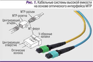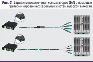 Затраты на создание кабельной инфраструктуры в рамках комплексного проекта создания ЦОДа обычно составляют от 2 до 10% от общего объема инвестиций в оборудование. С другой стороны, современный высокопроизводительный SAN-коммутатор может объединять свыше 500 портов в од-ном шасси, что предъявляет дополнительные требования к размещению и компактности кабельной проводки для его подключения. Поэтому все более популярными становятся кабельные системы высокой емкости на основе оптического интерфейса MTP (рис. 1). Такие системы Plug & Play существенно сокращают время монтажа и общую стоимость работ, а также упрощают подключение портов коммутатора благодаря возможности одновременной коммутации до 72 оптических волокон в одном соединении.