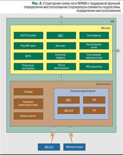 В рамках сети WiMax система определения местоположения логически может быть реализована в виде центра определения местоположения (Mobile Location Center, MLC), а точнее, в виде двух его компонентов: сервисного центра (Serving MLC, SMLC) и шлюзового центра (Gateway MLC, GMLC). Структурная схема сети WiMax с поддержкой функции определения местоположения приведена на рис. 5.