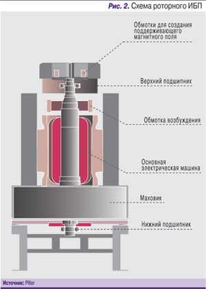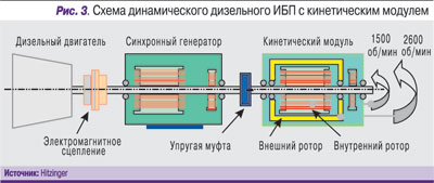 Компания Hitzinger выпускает два типа систем – NBDD с обычным маховиком и NBDK, в которой применяется специальный кинетический модуль. В системах NBDK скорость вращения свободного внешнего и внутреннего роторов составляет 2600 и 1500 об./мин соответственно. При отказе электропитания внешний ротор начинает затормаживаться магнитным полем внутреннего ротора. В это же время электронный блок управления стабильно удерживает частоту синхронного генератора. Кроме того, в системах Hitzinger используется специальный развязывающий дроссель (соединяющий вход сетевого напряжения и выход напряжения ИБП), препятствующий прохождению всех гармоник и переходных процессов между входом и выходом. Схема с внешним и внутренним роторами применяется и в решениях компании Hitec.