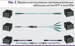 Но часто возникают и такие ситуации, когда создавать несколько точек кросс-коннекта не представляется возможным: например, мал доступный бюджет потерь. В этом случае оправдано использование «переходных» кабельных сборок: на одной стороне разъем МТР, на другой – стандартные типы разъемов. Пользователь получает преимущество компактности кабельной проводки высокой емкости и одновременно возможность прямого подключения к портам активного оборудования.